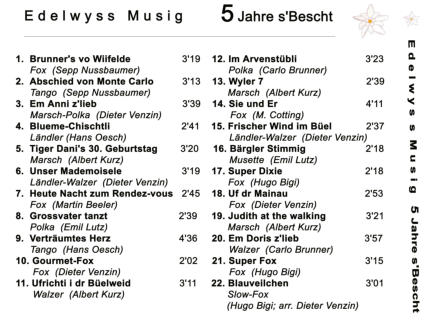 …«5 Jahre s‘Bescht» erschien im Jahre 2005 und enthält einen gesamtheitlichen Überblick überdas gespielte Repertoir. Alle Kompositionen stehen als Impression zum Download bereit